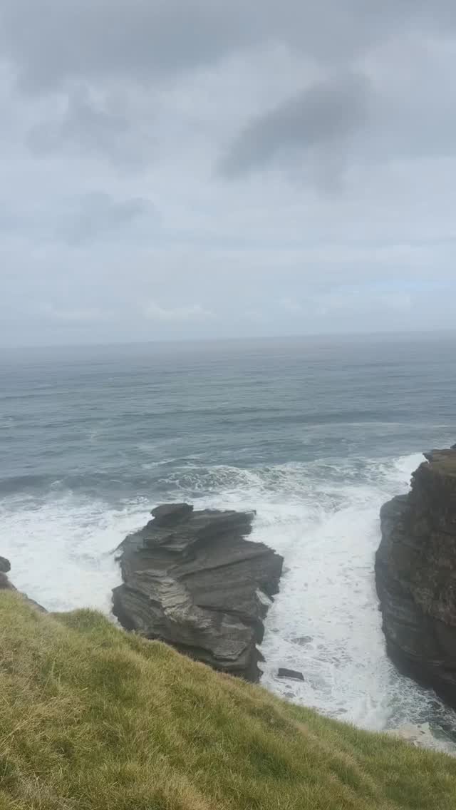 Hikers walking on a coastal path along steep cliffs overlooking the ocean, with cloudy skies and grassy terrain.